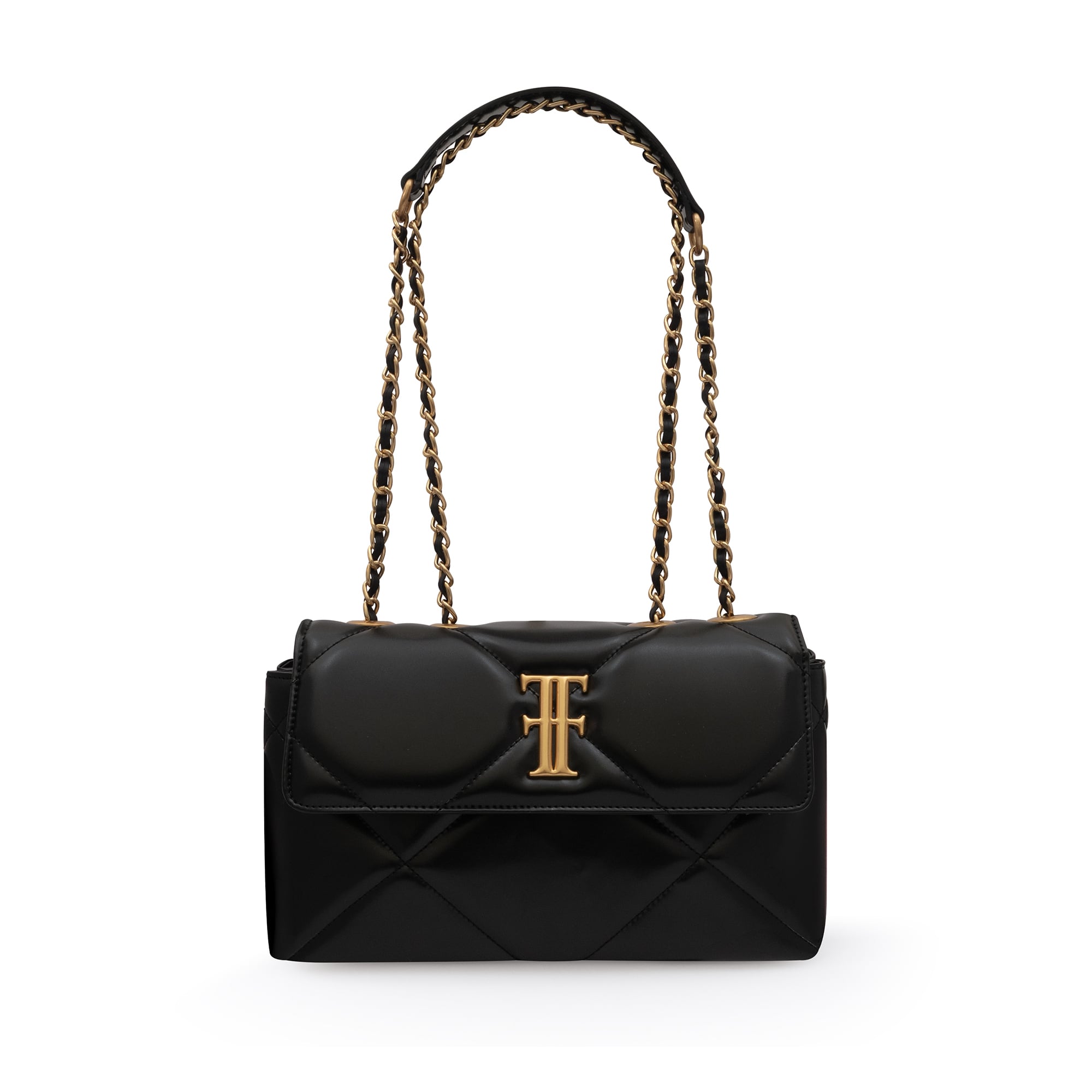 立体的な菱格キルティングが美しいミニショルダーバッグは、ブランド金属T字ロゴが上品な存在感を放ちます。フラップ開閉仕様で、コンパクトながら実用性も十分。チェーンショルダーは肩掛け・斜め掛けの2WAYで、日常使いからパーティーシーンまで幅広く対応します。
