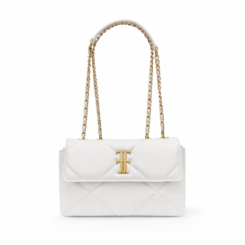 立体的な菱格キルティングが美しいミニショルダーバッグは、ブランド金属T字ロゴが上品な存在感を放ちます。フラップ開閉仕様で、コンパクトながら実用性も十分。チェーンショルダーは肩掛け・斜め掛けの2WAYで、日常使いからパーティーシーンまで幅広く対応します。